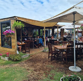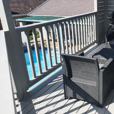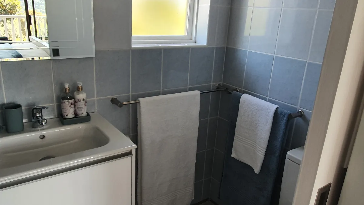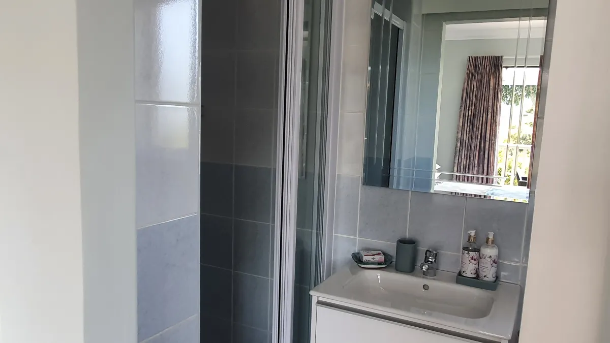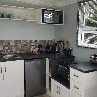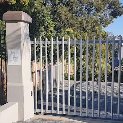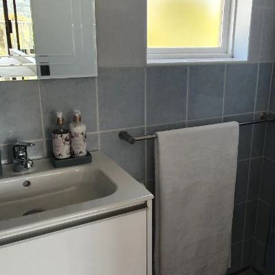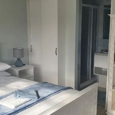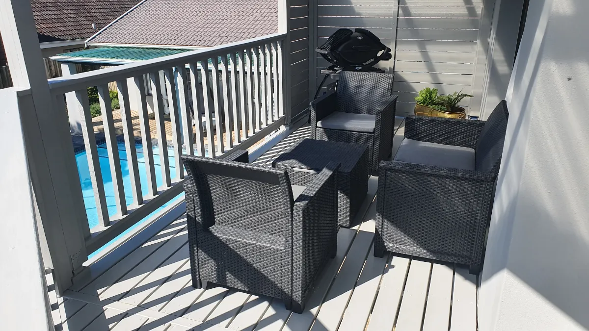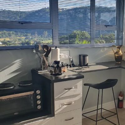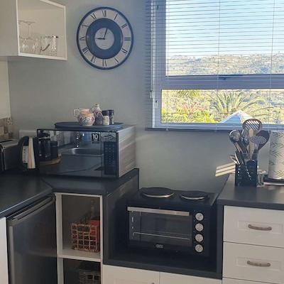 The apartment comprises of a queen-size bed, an en-suite bathroom fitted with a shower, basin, and toilet, and a fully equipped kitchen. The kitchen is equipped for self-catering with a fridge, mini-oven, 2-plate stove, microwave, and a kettle and toaster. The apartment is equipped with a TV with all DStv channels (Premium) and Netflix and features a covered wraparound balcony with a 4-seater and table set, and Weber gas braai.